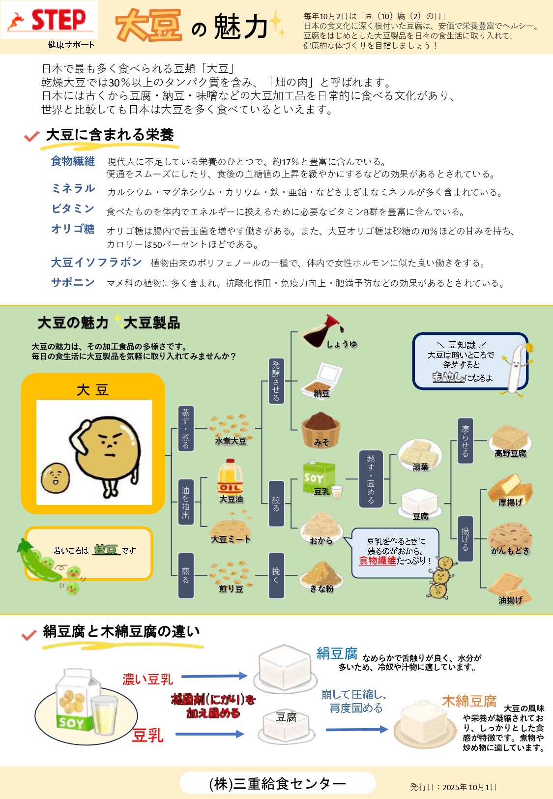 お便り 2025.09.25 「健康サポートSTEP」便り 2025年10月号発行しました 「健康サポートSTEP」便り 2025年10月号発行しました. 今月のテーマは大豆の魅力です。 お知らせ一覧へ戻る